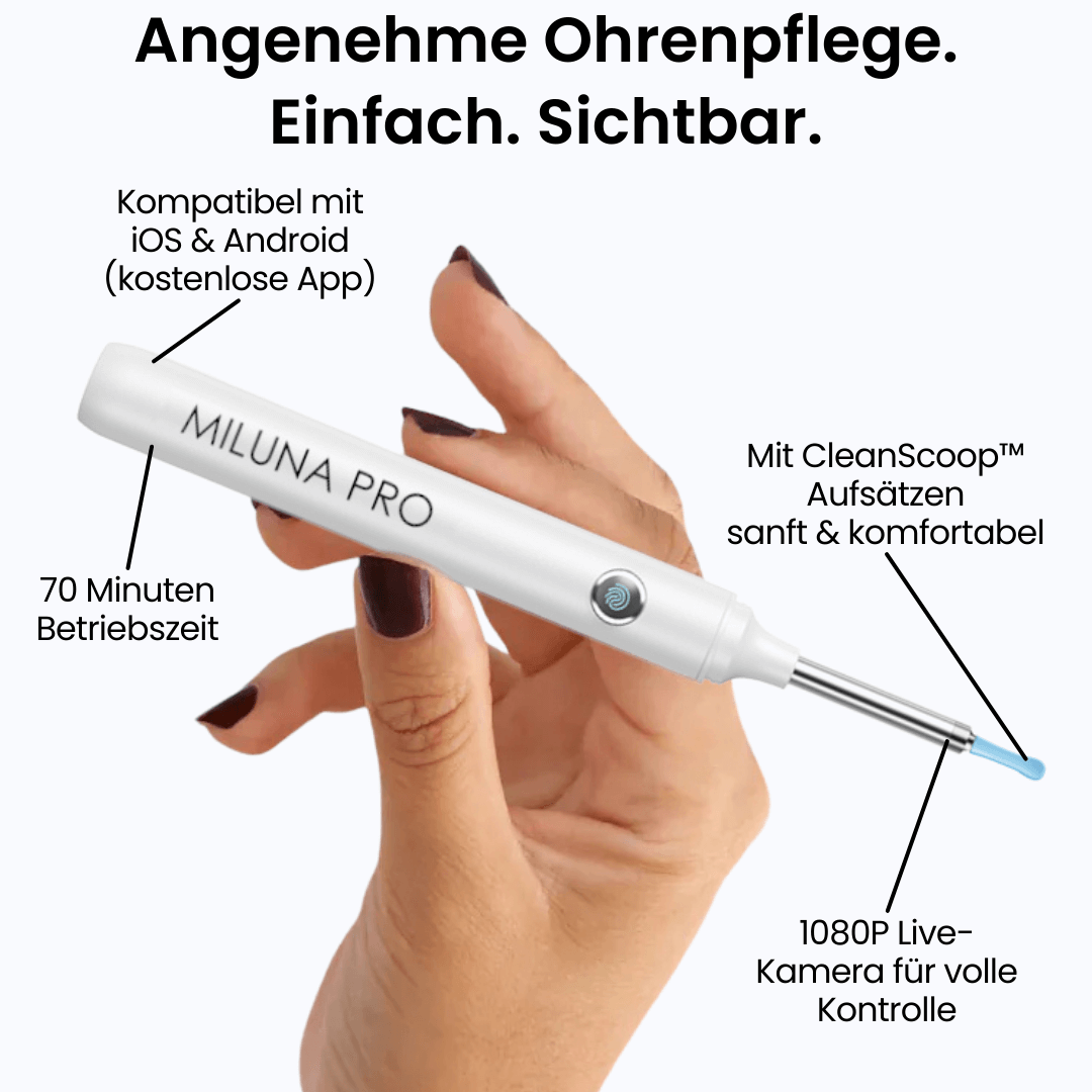 Auf dieser Seite findest du die komplette Anleitung zur Anwendung des Miluna™ Pro – dem visuellen Ohrenreiniger mit HD-Kamera und Livebild-Übertragung auf dein Smartphone. Schritt für Schritt zeigen wir dir, wie du das Gerät mit der Miluna App verbindest, die passenden CleanScoop™-Aufsätze verwendest und deine Ohren sicher und effektiv reinigen kannst.