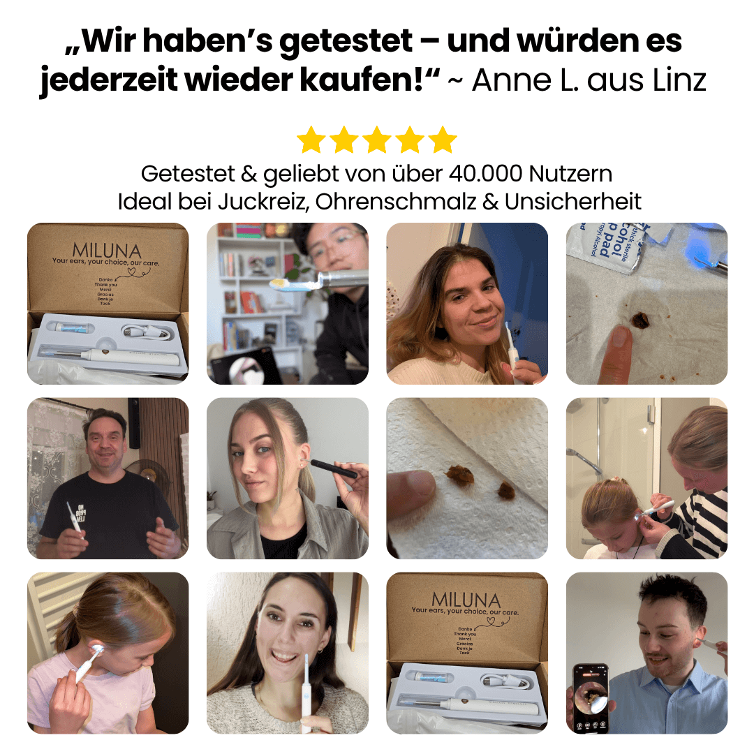 Weil man nie genau sieht, was im Ohr los ist, haben wir Miluna entwickelt – für klare Sicht, sanfte Reinigung und ein gutes Gefühl.“